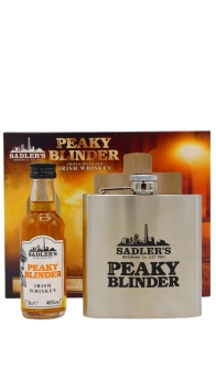 From the Sadler's distillery, this Irish whiskey is named after the infamous Peaky Blinder's street gang. - Peaky Blinders Irish Whiskey 40% ABV 5cl A pleasantly sweet, oaky Irish whiskey that has been finished in Sherry casks before bottling resulting in a rich, fruity whiskey - Branded Peaky Blinder's Metal Hip Flask